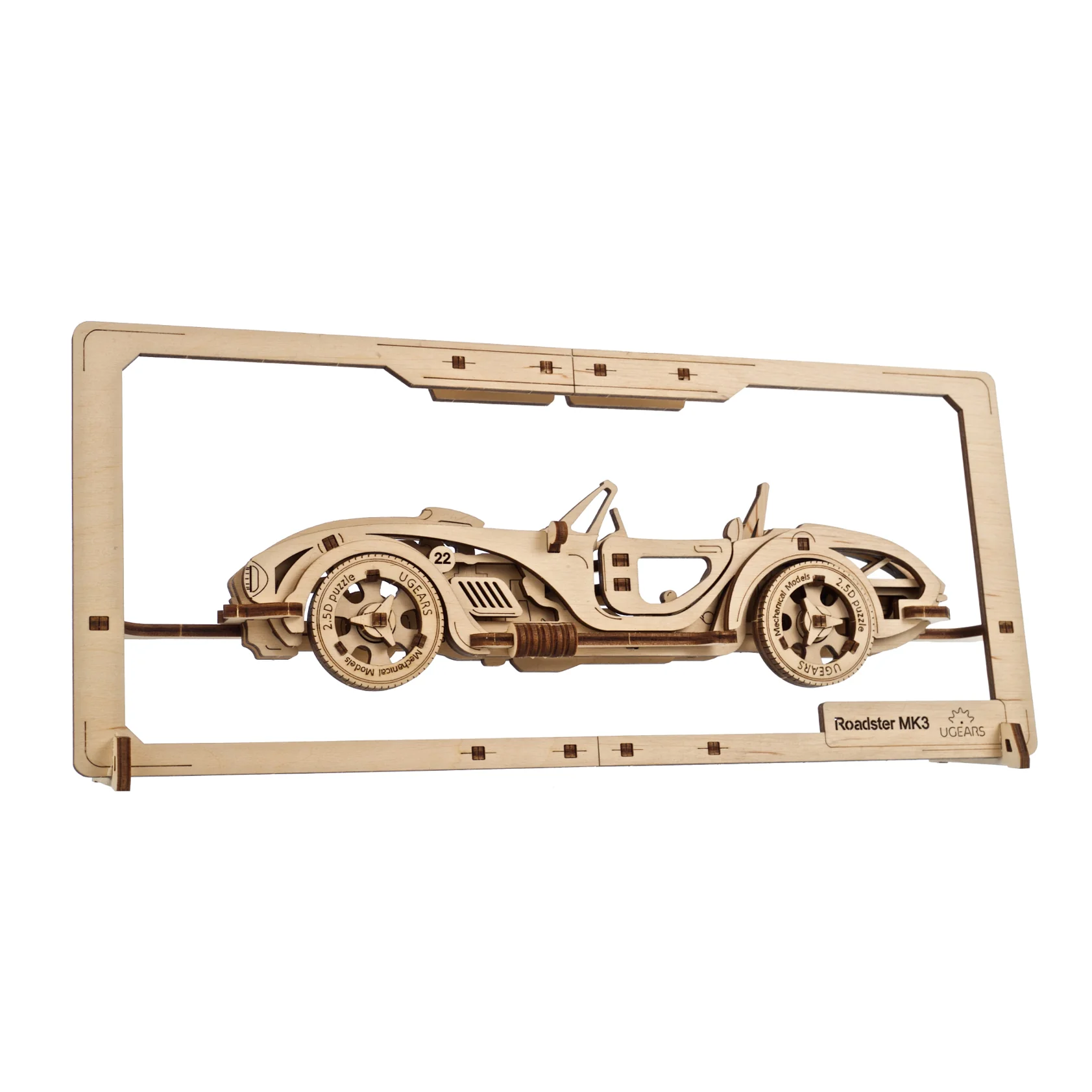 Ugears is loved all over the world for innovative wooden mechanical models that move, each with ingenious design and engineering. With our 2.5D models we've flattened everything and placed the model in a frame, for those who enjoy displaying attractive DIY crafts. Ugears 2.5D puzzles are a fun, dynamic alternative to traditional jigsaw puzzles, which have to be glued to a base then mounted in a frame if you want to preserve and display your work. Your Roadster MK3 2.5D picture puzzle comes in its own frame, with leg stands and a picture mount—just assemble and place or hang your Roadster wherever you want!