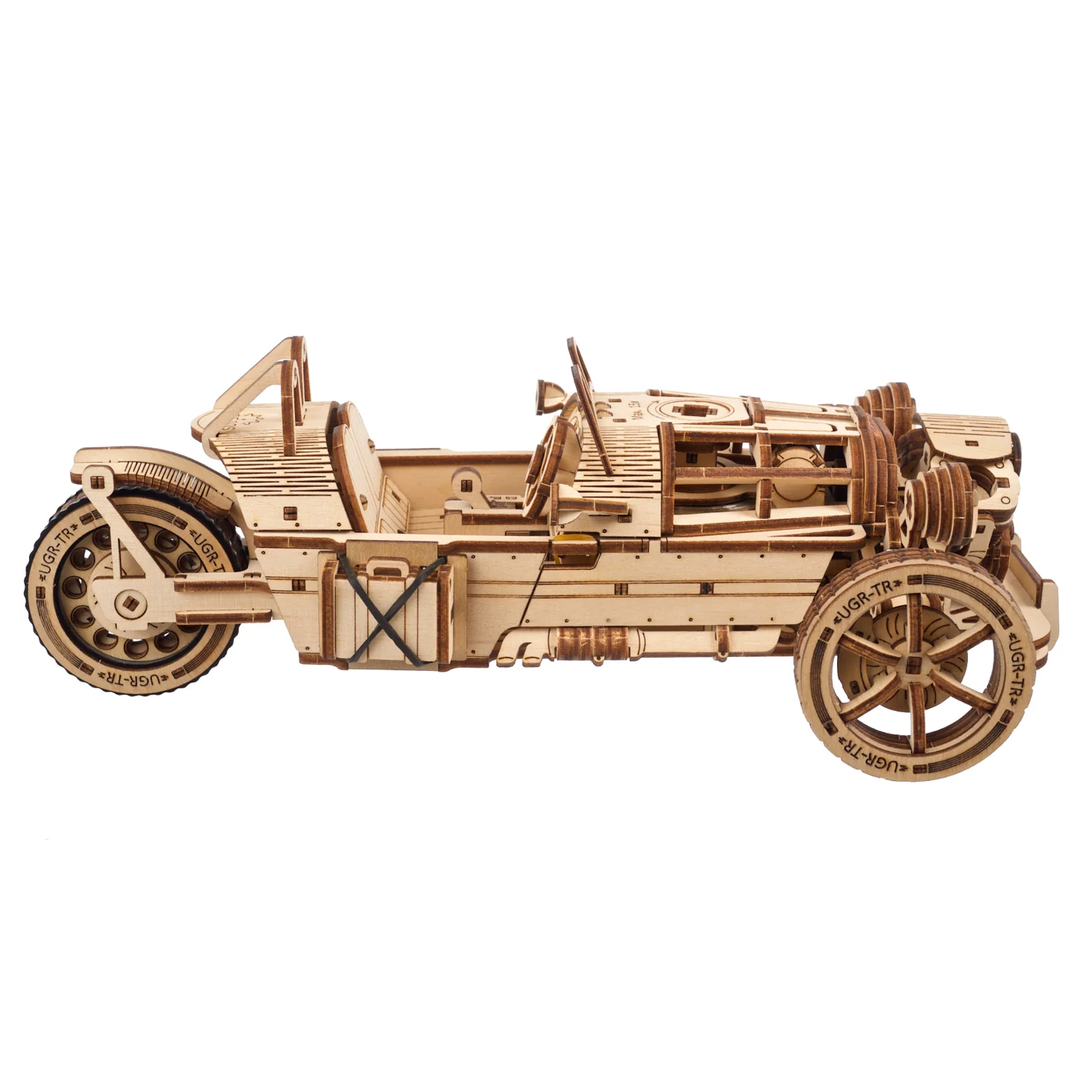The Three-wheeler UGR-S is a cool addition to the Ugears collection of motorcycles and automobiles. This stylish two-seater is a three-wheeled road and attention hog, with spring drive, front and rear suspension, a functional steering wheel that turns the front wheels left and right, and loads of great detail like moving pistons, big headlamps, custom exhaust pipes running along the side, a suitcase to place in the side-mounted luggage holder, and laser engraving. And that's not all—lift the two sides of the engine hood to see the gas tank and spring motor!